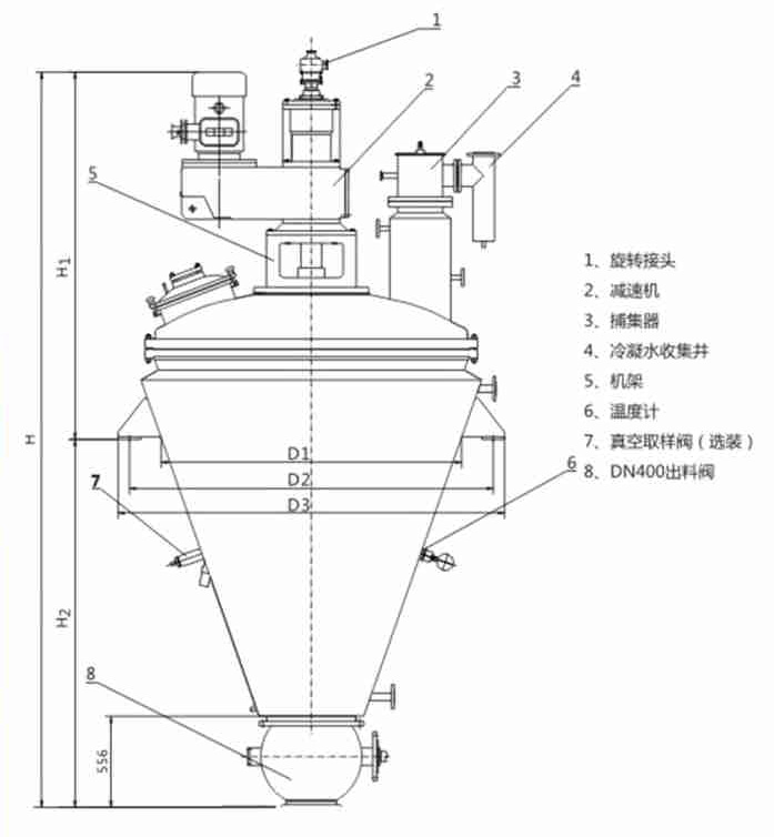 錐形螺帶真空混合/干燥機(jī)是集混合、干燥及蒸餾為一體的多功能設(shè)備,采用全密閉GMP清潔設(shè)計(jì),它的干燥效率是同等規(guī)格(雙錐回轉(zhuǎn)真空干燥機(jī))的3-5倍,裝料量是(雙錐回轉(zhuǎn)真空干燥機(jī))的2倍,相對(duì)效能提高6-10倍。螺帶攪拌器可使物料實(shí)現(xiàn)自下而上螺旋循環(huán)的攪拌效果,能得到高效的傳熱特性,物料裝填率在30%-100%情況下工作,可得到100%的加熱面積的利用效率。它是節(jié)能、高效、環(huán)保清潔的新型干燥設(shè)備。 技術(shù)參數(shù):