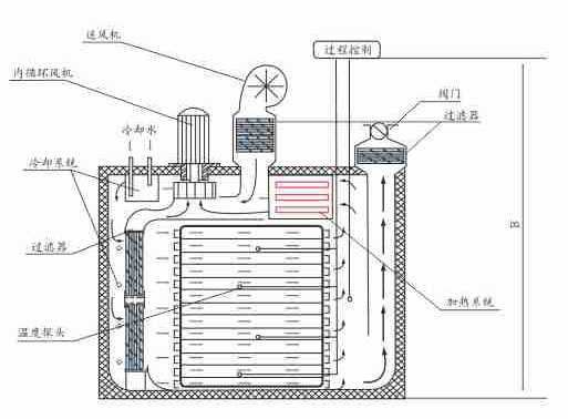 工作原理: 將裝滿物料的烘盤(pán)、瓶子或小車放入箱內(nèi),啟動(dòng)PLC可編程序控制系統(tǒng),內(nèi)循環(huán)風(fēng)機(jī)工作、加熱、蝶閥同時(shí)開(kāi)啟、干燥箱迅速升溫。在內(nèi)循環(huán)風(fēng)機(jī)作用下,干熱空氣通過(guò)耐高溫高效過(guò)濾器進(jìn)入箱體,在微調(diào)節(jié)板作用下形成一個(gè)均勻分布空氣向箱體內(nèi)傳遞,干燥空氣吸收瓶子(物料、物品)表面的水份,進(jìn)入加熱通道蒸發(fā)排出、干空氣在風(fēng)機(jī)作用下定向循環(huán)流動(dòng),水蒸氣排出。隨著水蒸氣逐漸減少、同時(shí)間隙性補(bǔ)充新鮮過(guò)濾空氣,箱體內(nèi)呈微正壓狀態(tài),恒溫結(jié)束,過(guò)程控制完畢。開(kāi)啟送風(fēng)或(進(jìn)水)強(qiáng)制冷卻,自動(dòng)蝶閥進(jìn)入關(guān)閉狀態(tài),聲光提示開(kāi)門(mén)出瓶。